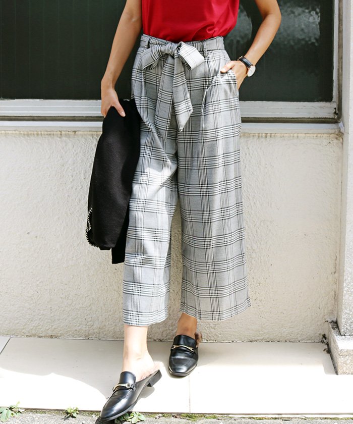 ワイドパンツ レディース りぼんベルト グレンチェック柄 チェック S/M/L [クロップド]