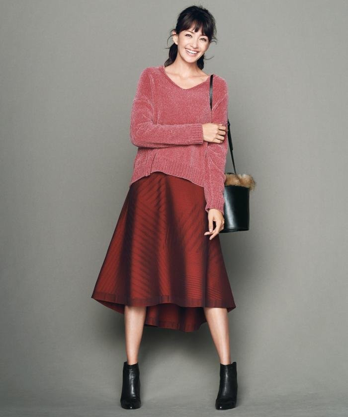 自由区マガジン“ANOTHER DOOR(アナザードア)” P22掲載リバーシブルで堪能できる 大胆模様のオトナスカート【商品説明】トレンドのフィッシュテールが目を惹くミモレ丈スカート。幾何学模様と無地のリバーシブル仕様で、表と裏2つのイメージが楽しめます。継ぎ目なしの大胆な柄は、他にはない高級感溢れるデザイン。仕立て映えもよく、立体的なフレアラインが歩くたびに優美な印象です。シェニールヤーンのニットプルオーバー(品番:KRWRHW0414)との異素材ミックスのワントーンコーディネートが今シーズンのおすすめです。【素材】二重織りで仕上げた表面感のあるジャカード素材を使用。表と裏で印象が異なり、リバーシブルで着用可能です。繊細な素材感ながら、「手洗い可能」を実現した商品です。