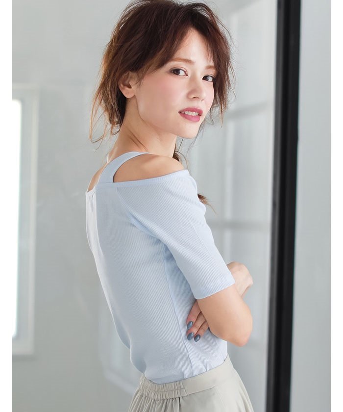 コットン100%の生地を旬のリブ生地で仕立てたオープンショルダートップス。