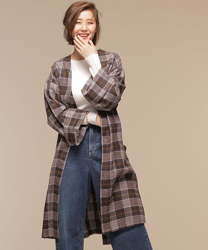 あたたかみのあるチェックが印象的なコート。さらっと羽織るだけでサマになるガウンタイプ。カットソーやタートルニットの上から羽織れば、シンプルな着こなしも一気にこなれスタイルに。半端丈の袖からレイヤードさせるインナー選びも楽しみのひとつ。共布ベルトが付いているから、スタイリングに合わせた着こなしが叶います。