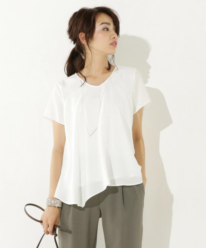 2017SS表地にはストレッチ性と適度な反発感とドレープ性を両立した糸と、接触冷感、吸湿性、速乾性に優れた2種類の糸を二重織りに織り上げています。適度な厚み、透け感やソフトな風合いが表現されており、夏に素肌に着たい素材感。ランダムヘムが特徴のブラウス。緩やかなVネックや女性らしい動きのあるアシンメトリーのフレアに拘った1枚です。後ろ身頃は上品な光沢感のあるスムース素材を使用し軽やかに仕上げました。スーツ(JKWWHM0401)のインナーとしてのスタイリングがお勧めのアイテムは、ジャケットを脱いでも袖付きなので1枚でもさまになる優秀アイテム。