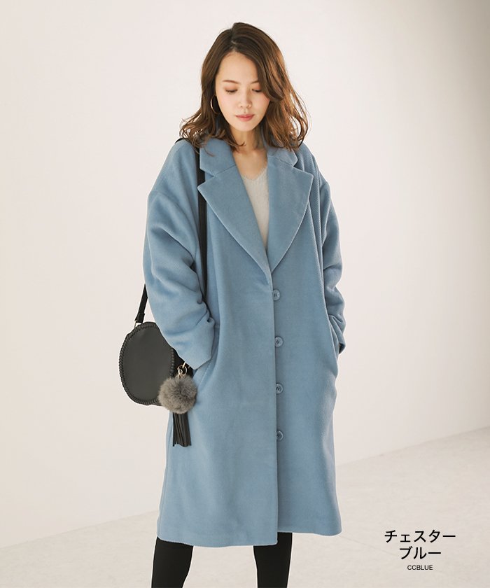 旬のハッピーカラーと取り入れたノーカラーコートです。