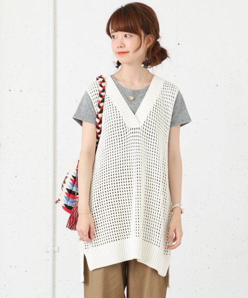 透かし編みで透け感たっぷりのニットベスト。深いVネックにタップリとある丈感でとことんルーズに着こなせるアイテムです。Tシャツとレイヤードさせてカジュアルに着るのがおススメです。敢えてワイドパンツやロングスカートとと合わせてルーズなシルエットに。