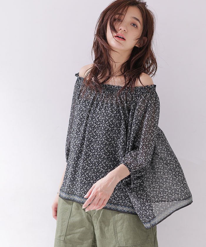ビンテージライクな雰囲気のペイズリーブラウス。デコルテをすっきり見せ実は着やせ効果の高いオフショルダーは、春夏も引き続き注目したい。肩を隠しても着られるので着こなしに合わせて2wayで楽しめます。裾の切替パネルも大人らしくて素敵。落ち着いたダークカラーを軽やかなシフォンの素材感が重くなりすぎない絶妙なバランス感をもたせてくれて一枚でおしゃれを演出してくれます。