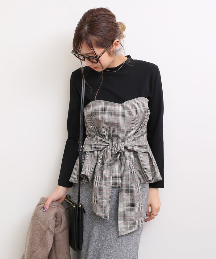 ブラウス ウエストリボン レディース グレンチェック柄 レイヤード風 トップス