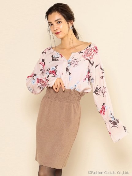 ウエストラインをゴムシャーリングでくしゅっとさせたタイトスカート。バックに配したジップが、後ろ姿をオシャレに演出します。